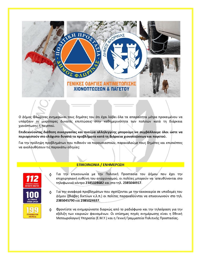Ο Δήμος Φλώρινας ενημερώνει τους δημότες του ότι έχει λάβει όλα τα απαραίτητα μέτρα προκειμένου να υπάρξουν οι μικρότερες δυνατές επιπτώσεις στην καθημερινότητα των πολιτών κατά τη διάρκεια χιονόπτωσης ή παγετού.