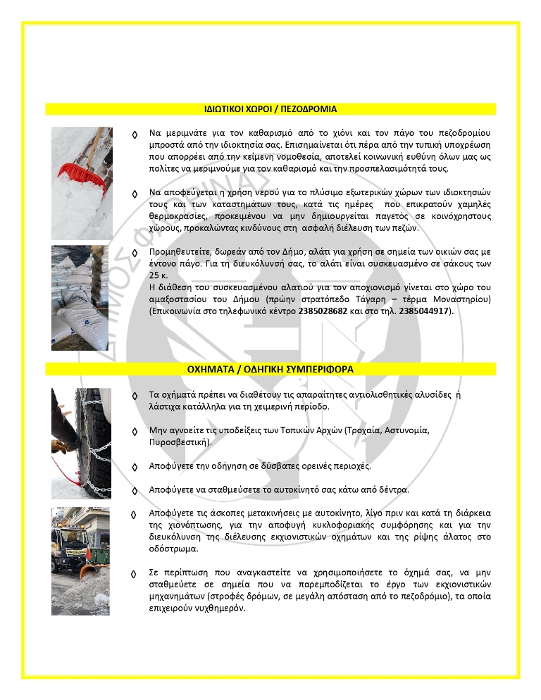 Επιδεικνύοντας διάθεση συνεργασίας και πνεύμα αλληλεγγύης μπορούμε να συμβάλλουμε όλοι ώστε να περιοριστούν στο ελάχιστο δυνατό τα προβλήματα κατά τη διάρκεια χιονοπτώσεων και παγετού.